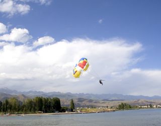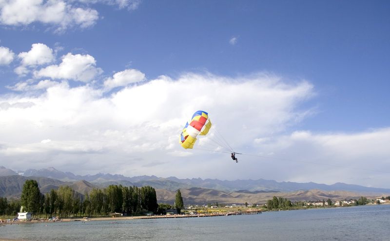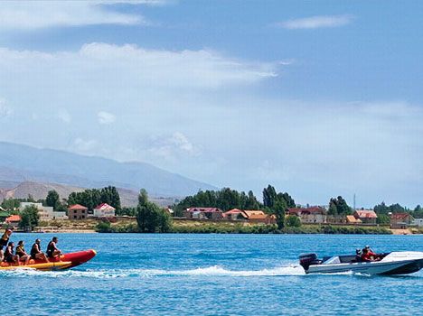 Самолетом до аэропорта «Иссык-Куль» (с. Тамчи), далее на такси.