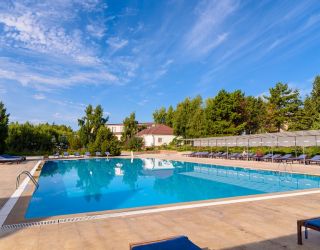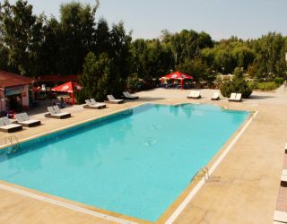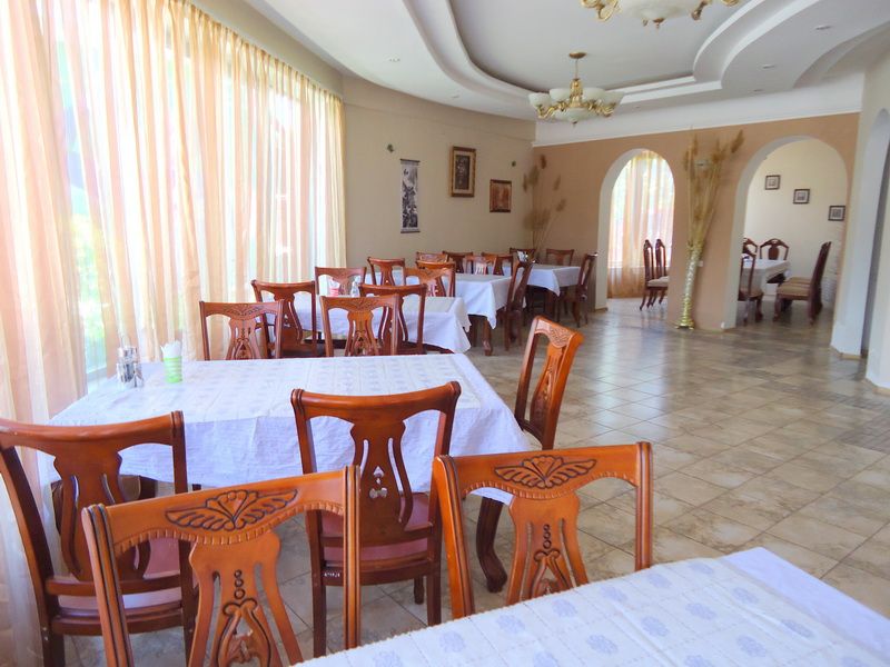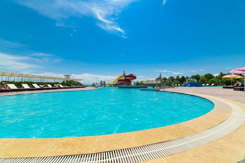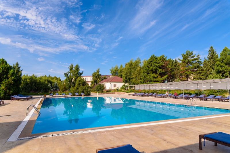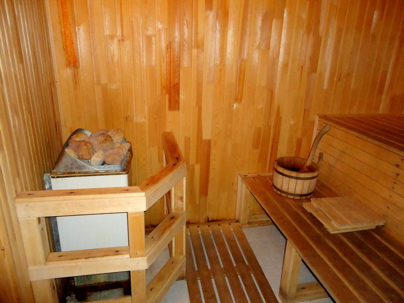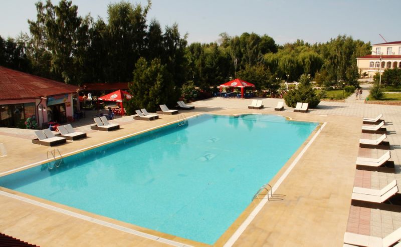 Особого упоминания заслуживают большой открытый бассейн отеля, посещение которого входит в стоимость проживания, и русская баня.